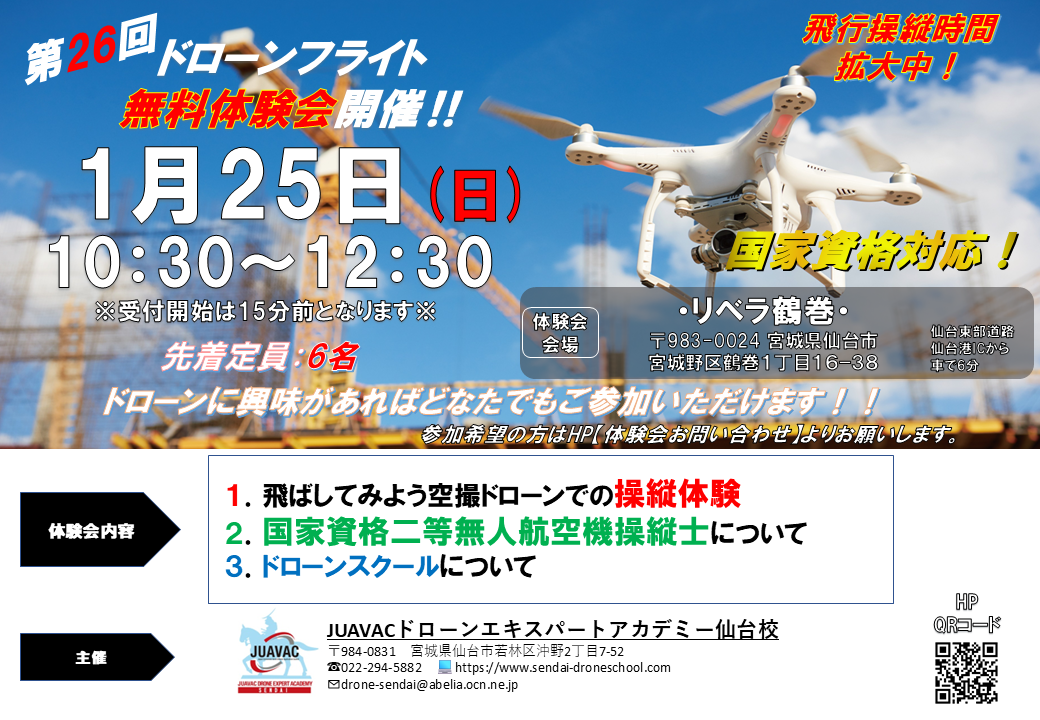 2026年1月25日(日)JUAVAC ドローンエキスパートアカデミー仙台校にてドローンフライト無料体験会を開催いたします。